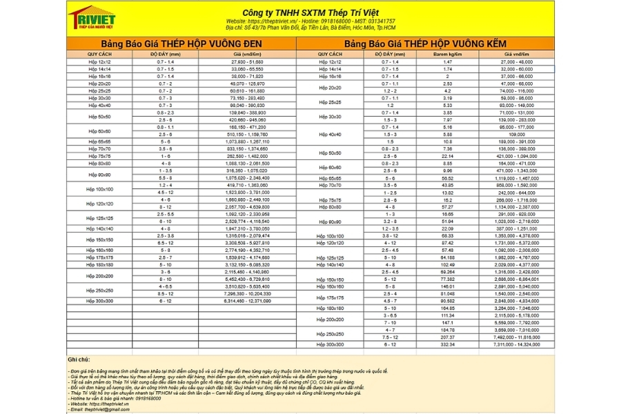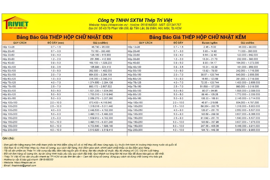 Thông tin trong bảng báo giá thép hộp Hoa Sen mới nhất trên đây hy vọng đã giúp quý khách dễ dàng so sánh quy cách, độ dày và lựa chọn sản phẩm phù hợp cho công trình. Giá thép có thể thay đổi theo thời điểm và số lượng đặt hàng thực tế. Để nhận báo giá thép Hoa Sen chính xác, cạnh tranh, quý khách vui lòng liên hệ Thép Trí Việt – tổng kho sắt thép uy tín để được tư vấn và hỗ trợ tốt nhất.