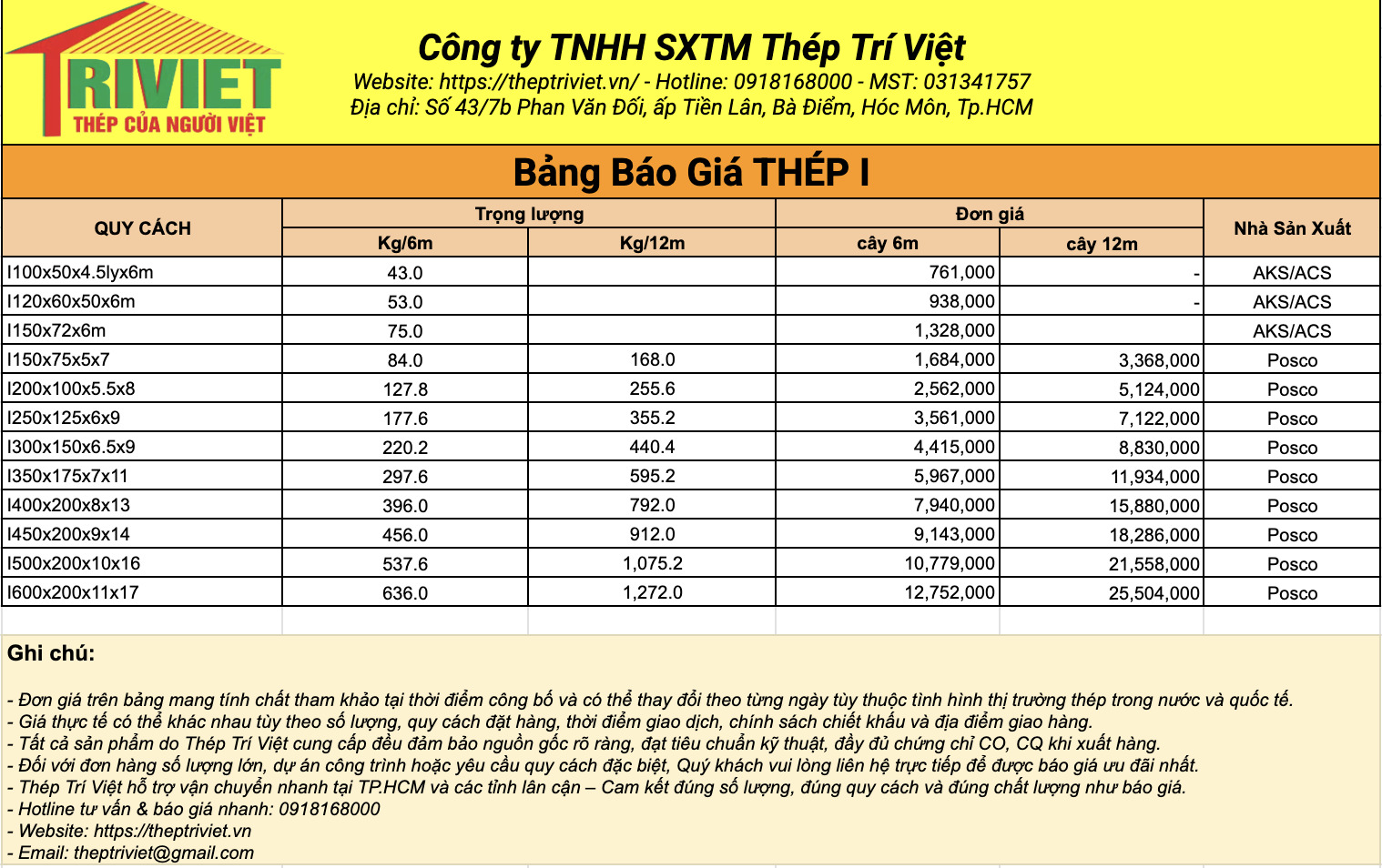 Bảng báo giá thép hình I mới nhất dưới đây sẽ giúp bạn theo dõi biến động thị trường và đưa ra lựa chọn chính xác hơn khi mua vật liệu xây dựng.