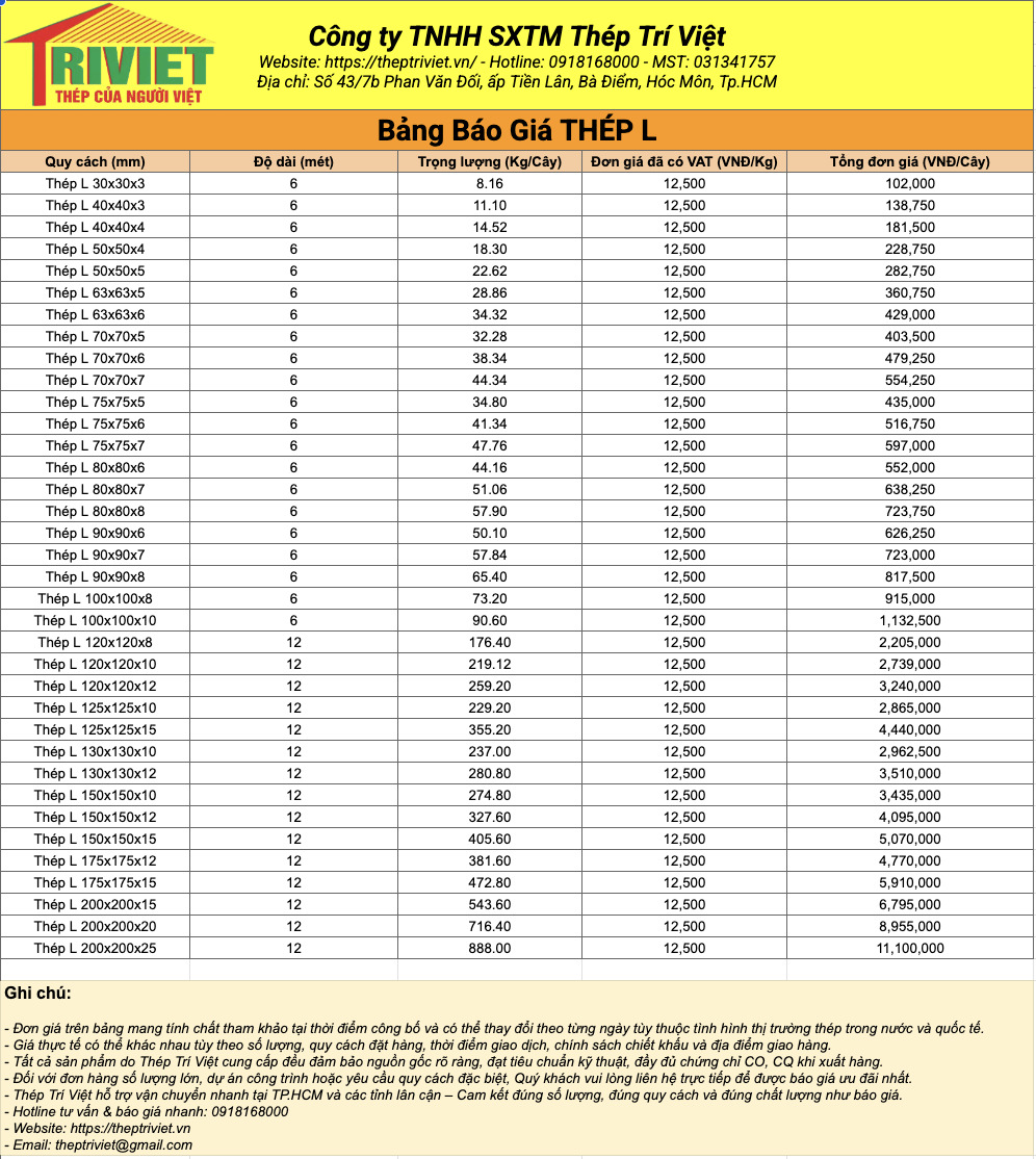 3. Bảng báo giá thép L cập nhật mới nhất tại Thép Trí Việt
