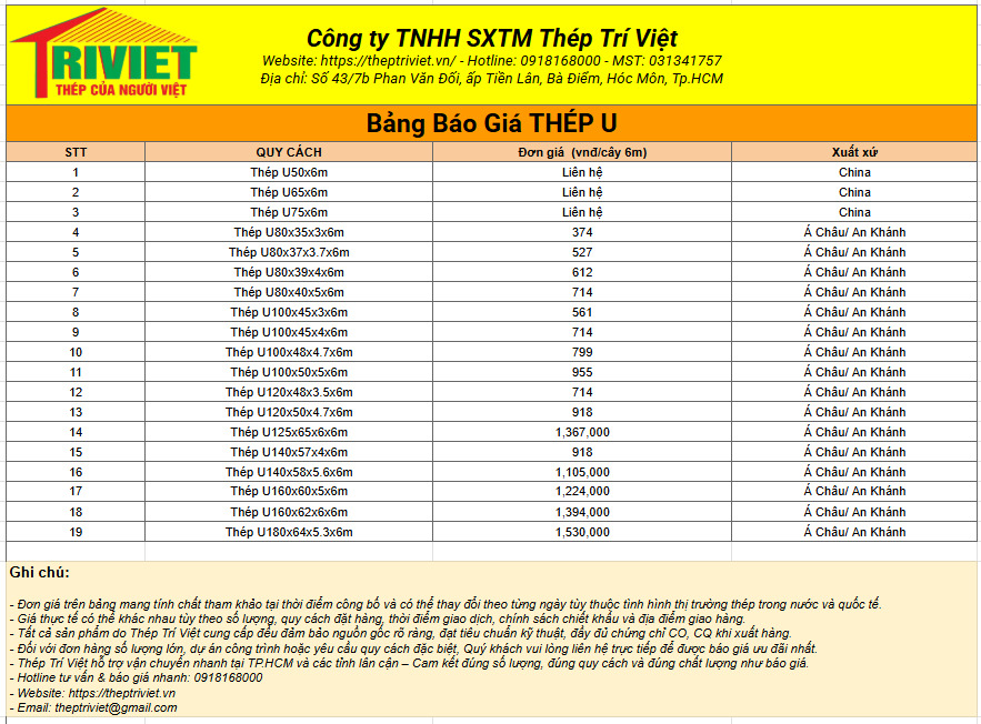 5. Bảng báo giá thép U cập nhật mới nhất tại Thép Trí Việt