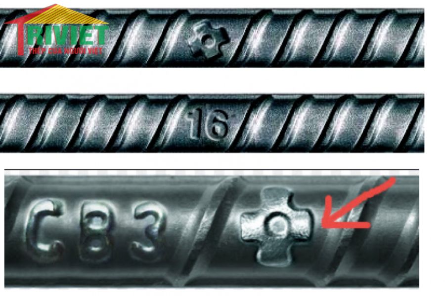 • Đặc điểm nhận diện: Trên thân thép có gân vằn dạng xương cá, kèm ký hiệu hình hoa mai dập nổi, khoảng cách giữa các ký hiệu dao động từ 1 – 1,2m.