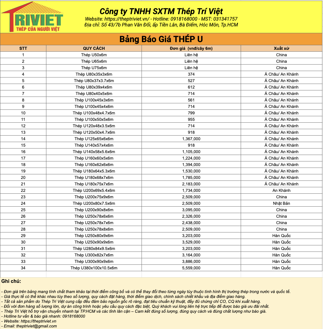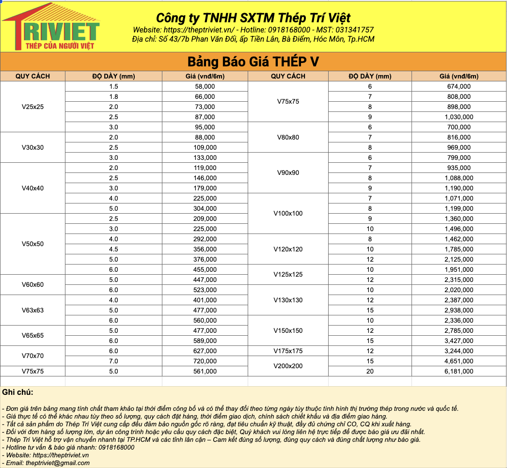 Bảng giá thép hình Việt Nhật mới nhất được tổng hợp theo size và độ dày phổ biến. Do giá thép biến động liên tục, vui lòng liên hệ để nhận báo giá nhanh nhất.