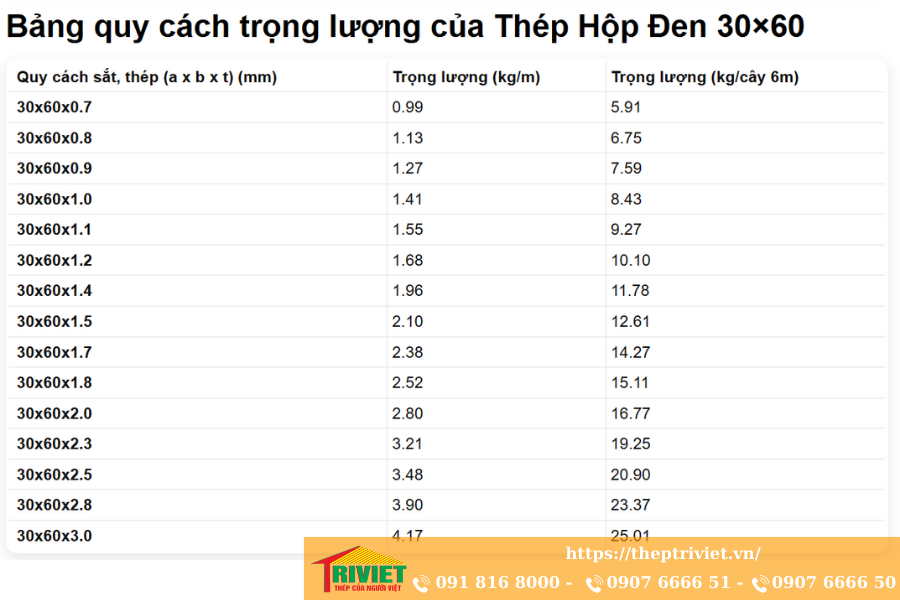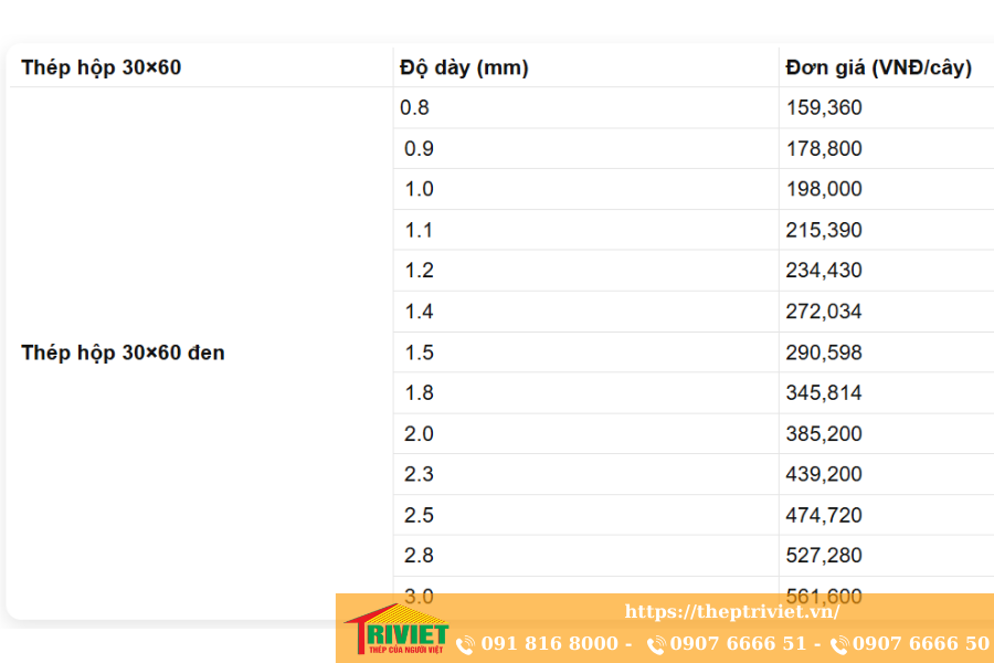 Thép hộp đen 30×60 có mức giá dao động tùy thuộc vào thời điểm, khối lượng đặt hàng và biến động nguyên liệu. Năm 2025, Thép Trí Việt cập nhật bảng giá thường xuyên, cam kết mang đến mức giá tốt nhất cho khách hàng.