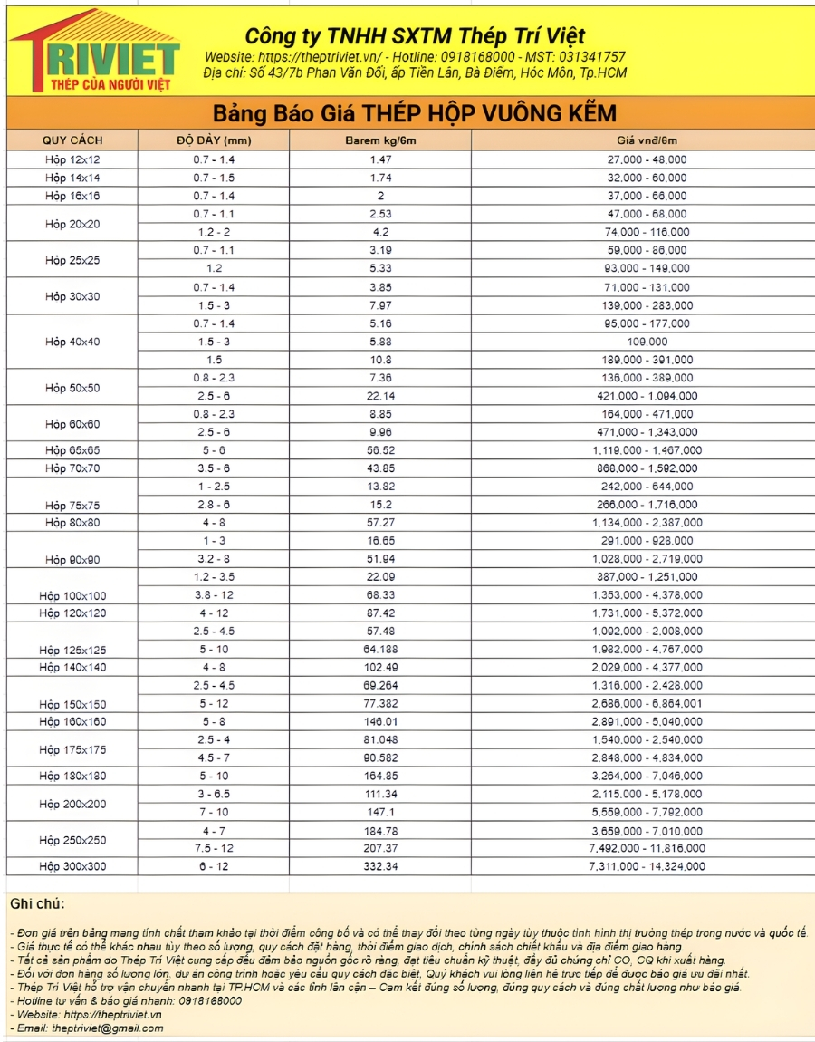 Bảng giá thép hộp vuông mạ kẽm được cập nhật liên tục nhằm giúp khách hàng dễ dàng lựa chọn đúng tiêu chuẩn, kích thước phù hợp với nhu cầu thi công. Thép Trí Việt luôn đảm bảo mức giá cạnh tranh, hỗ trợ tối ưu chi phí cho mọi công trình.