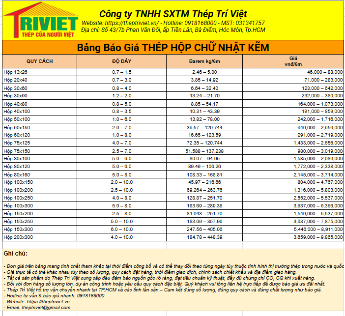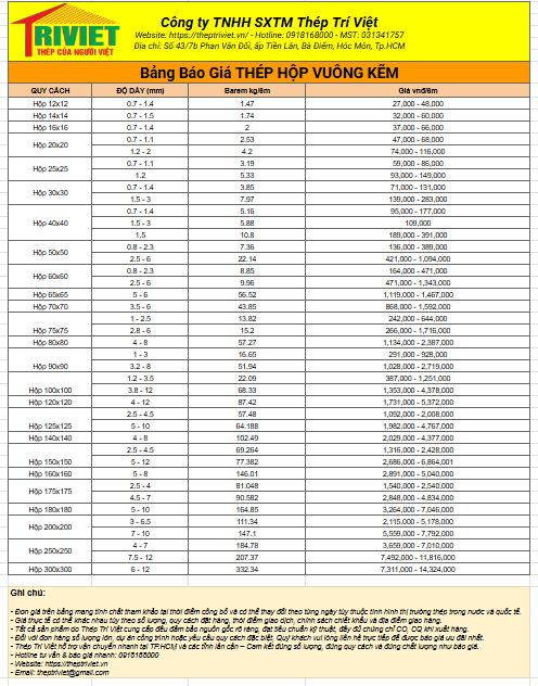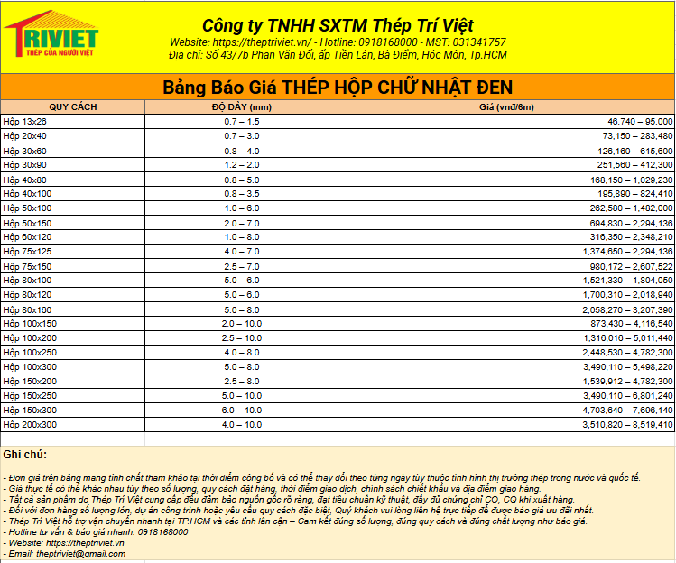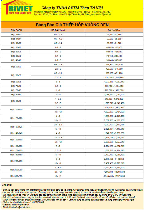 Thép Trí Việt liên tục cập nhật báo giá thép hộp đen mới nhất theo biến động thị trường. Chúng tôi cam kết mức giá cạnh tranh kèm chính sách chiết khấu hấp dẫn cho nhà thầu. Dưới đây là thông tin chi tiết giúp bạn dễ dàng hạch toán ngân sách cho dự án của mình.