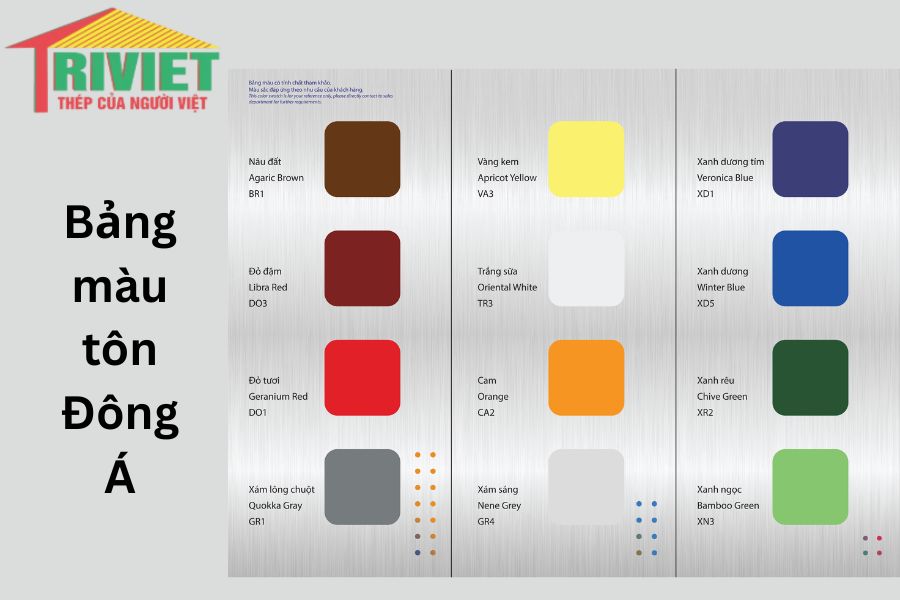 Màu tôn Đông Á được Thép Trí Việt cập nhật mới nhất từ nhà máy tole Đông Á. Chúng tôi gửi tới Quý khách danh sách tên màu tôn và mã màu tôn để tiện theo dõi.