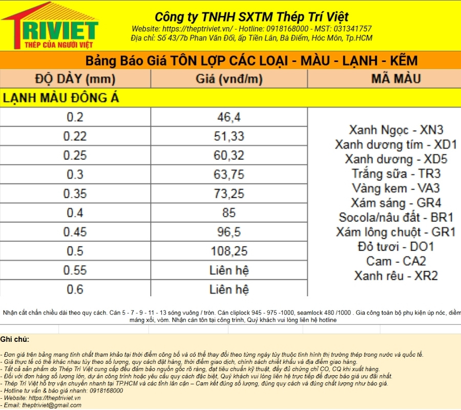 Giá Tôn Đông Á hiện dao động từ 55.000 VND đến 107.000 VND, phụ thuộc vào độ dày và màu sắc tôn bạn chọn. Thép Trí Việt cung cấp bảng giá tôn Đông Á mới nhất trực tiếp từ nhà máy, giúp quý khách dễ dàng tham khảo.