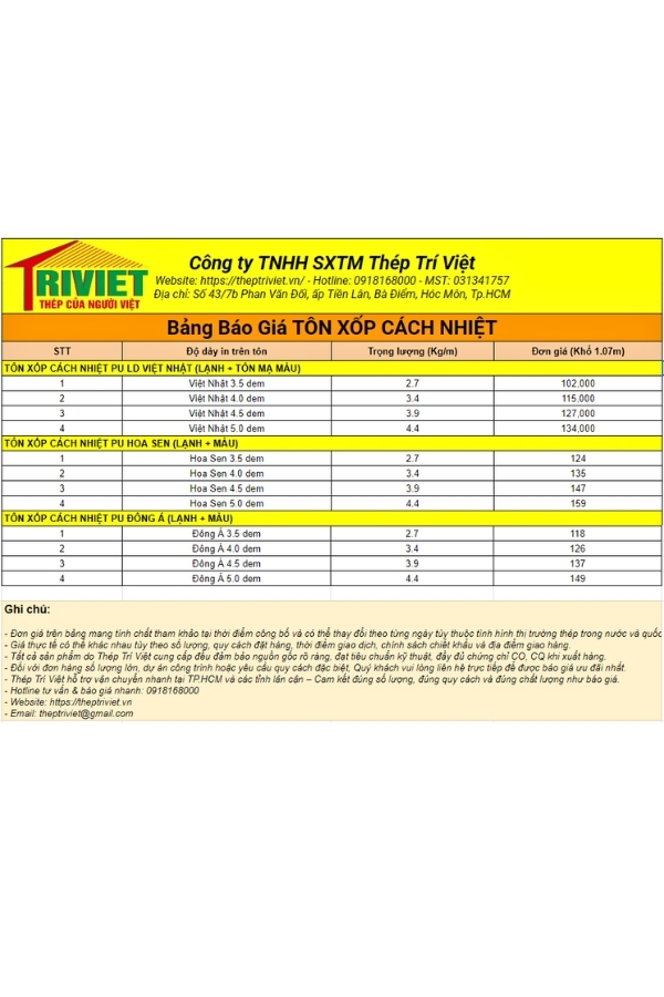 Bảng báo giá tôn PU cách nhiệt mới nhất do Thép Trí Việt cung cấp được cập nhật thường xuyên theo thị trường, đảm bảo giá cạnh tranh, nguồn hàng ổn định và thuận tiện cho khách hàng tham khảo, lựa chọn.