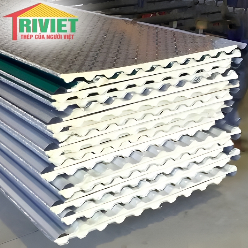 - Lớp foam PU cách nhiệt (Polyurethane): Lớp vật liệu này đóng vai trò chính trong việc đảm bảo hiệu quả cách nhiệt và cách âm, giúp giảm đáng kể lượng nhiệt tác động vào công trình.