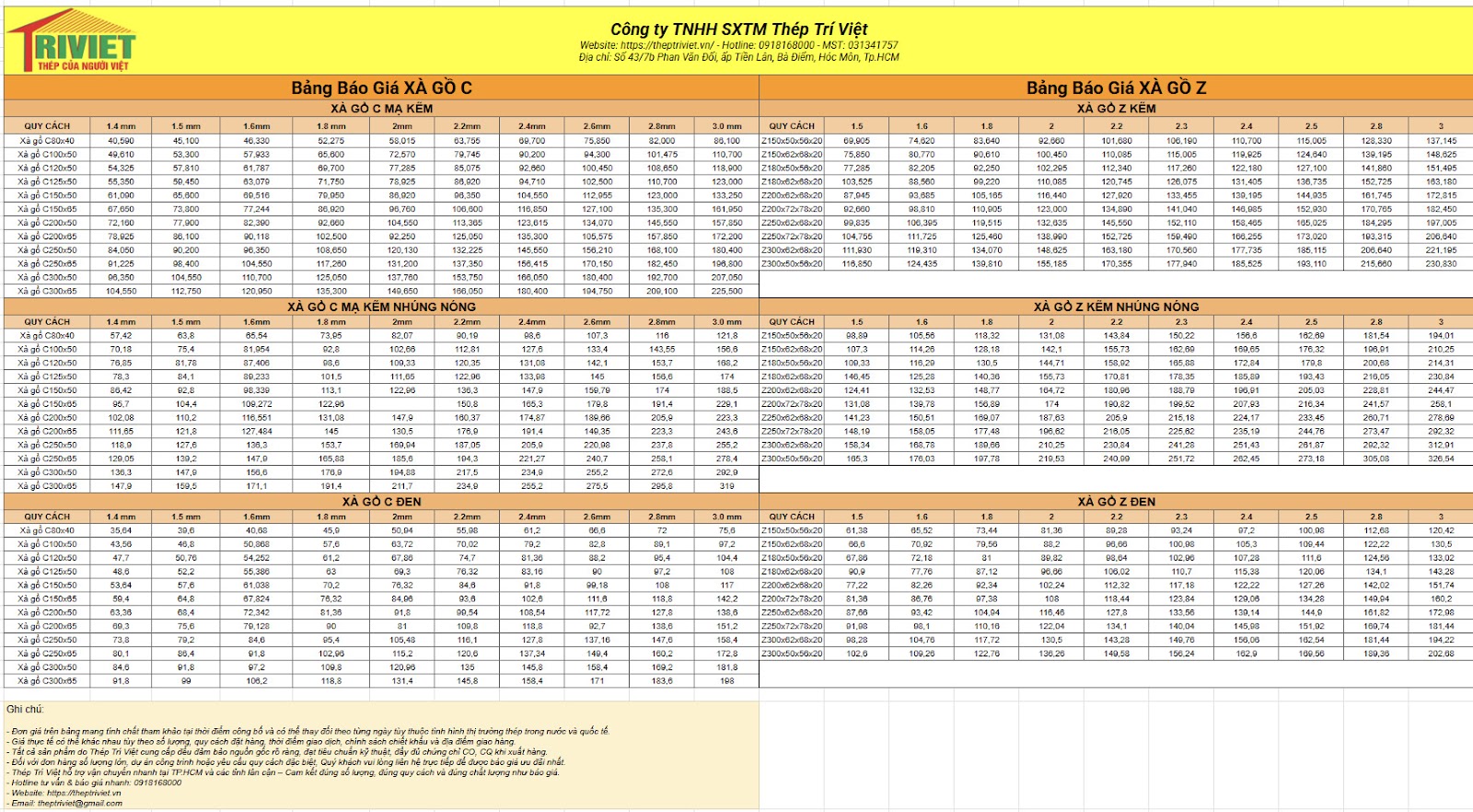 1. Bảng báo giá xà gồ mới nhất tại Thép Trí Việt