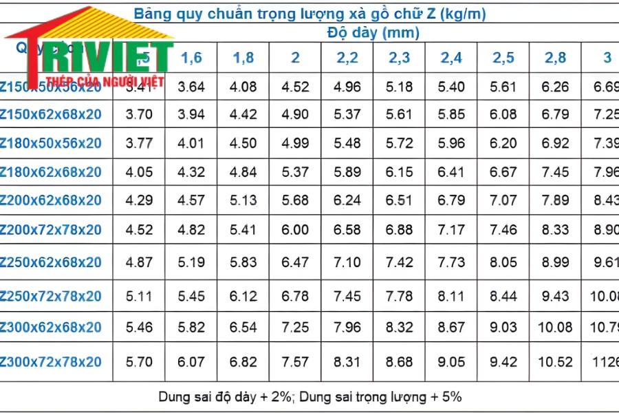 Dưới đây là thông số chi tiết về trọng lượng của các dòng xà gồ phổ biến hiện nay: